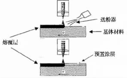 為了防止在高速、高溫、高壓、重載、腐蝕介質(zhì)等環(huán)境下工作的零件不因便面的局部損壞而報(bào)廢,提高零件的可靠性,延長(zhǎng)使用壽命,世界各國(guó)都在研究和應(yīng)用各種提高零件表面性能的表面工程技術(shù)。傳統(tǒng)的表面改性技術(shù),如各種噴涂層。鍍層等,由于較差的層間結(jié)合力以及受平衡溶解度小,及固態(tài)擴(kuò)散性差的限制,應(yīng)用效果并不理想。大功率激光器和寬帶掃描裝置的出現(xiàn),為材料表面改性提供了一種新的有效手段。在各類激光束處理中,激光熔覆是經(jīng)濟(jì)效益較高的一種新的涂層表面改性技術(shù),它可以在廉價(jià)基材上制備出高性能貴重的熔覆層表面,以降低材料成本,節(jié)約貴重稀有的金屬材料,降低能量消耗,提高金屬零件的使用壽命。激光熔覆裝置如圖所示,其中上圖所示的是同步送粉法,下圖為預(yù)置涂層法。