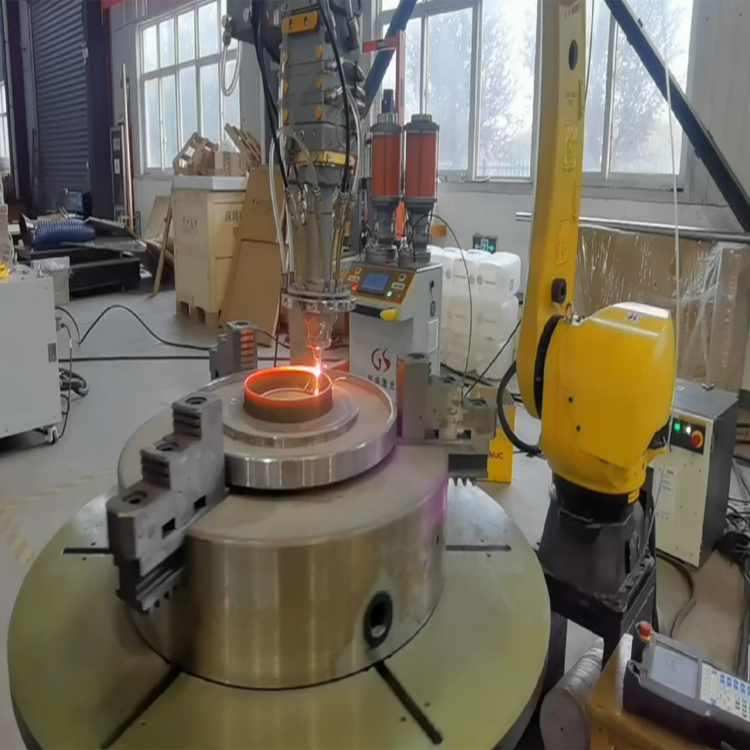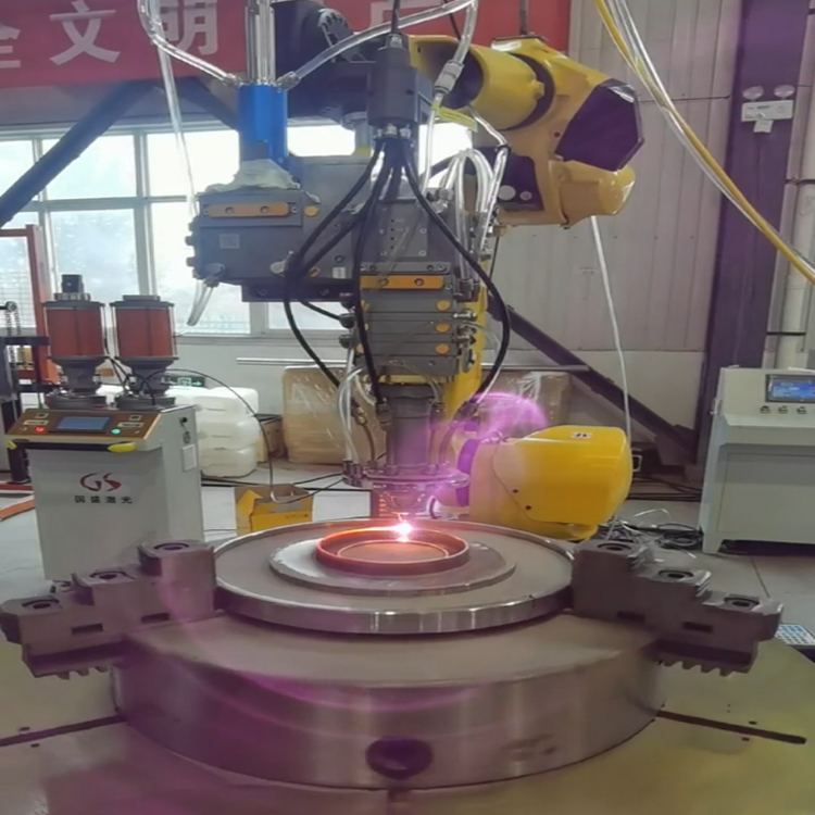 八軸聯(lián)動激光熔覆設(shè)備,是國盛激光自主研發(fā)的以機器人為運動核心,可適應(yīng)各種復(fù)雜結(jié)構(gòu),和非標準零件的激光熔覆加工系統(tǒng)。該系統(tǒng)配置靈活多樣,根據(jù)客戶應(yīng)用場景可配置不同規(guī)格的機器人,同時選配變位機、轉(zhuǎn)臺、滑臺以適應(yīng)不同加工類型工件的激光熔覆加工及表面處理。設(shè)備主要由前端執(zhí)行機構(gòu)和后端設(shè)備組成,前端執(zhí)行機構(gòu)包括機械臂、變位機、電氣控制系統(tǒng)、激光熔覆頭、熔覆噴嘴組成;后端設(shè)備包括熔覆專用激光器、熔覆專用水冷機、穩(wěn)壓電源、送粉器等。